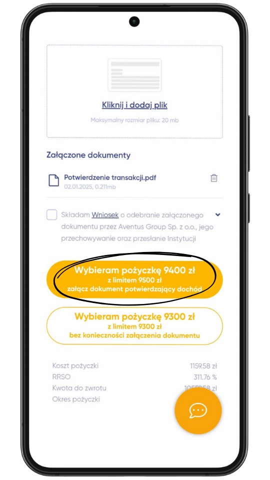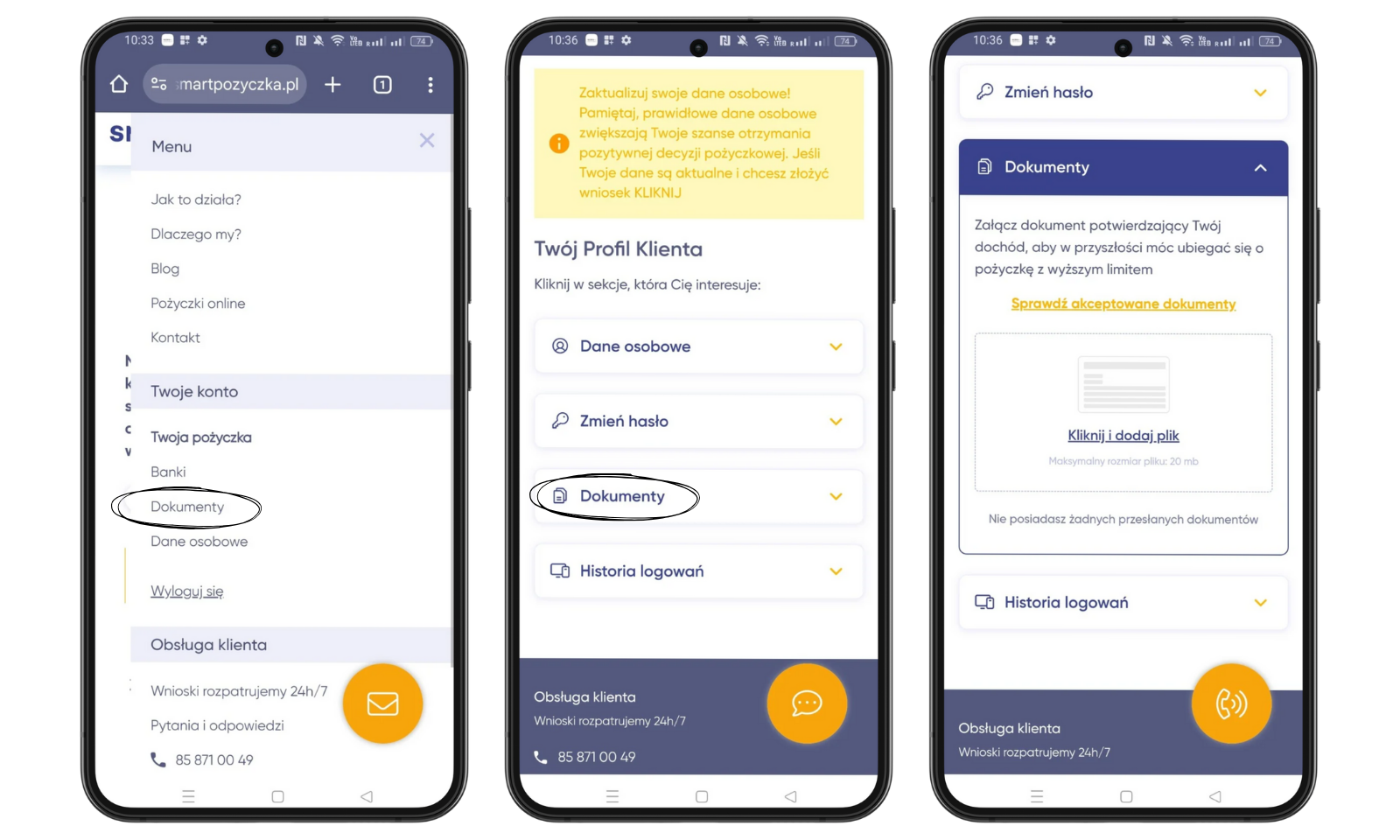 UWAGA! Dokumenty potwierdzające wysokość Twoich dochodów możesz załączyć jeszcze przed złożeniem wniosku o pożyczkę w wyższej kwocie, dzięki czemu w przyszłości proces aplikacji przebiegnie sprawniej. Możesz to zrobić logując się do swojego profilu w strefie klienta i wchodząc w zakładkę “Dane osobowe”. Dodanie dokumentu jest bardzo proste zarówno na telefonie, jak i na komputerze.